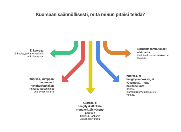 ⚠️ Milloin lääkäriin? Hakeudu lääkärin arvioon, jos kuorsaus on erittäin kovaa, siihen liittyy hengityskatkoksia, päiväväsymys on voimakasta tai kumppanisi huomaa hengityksen pysähtyvän hetkellisesti.